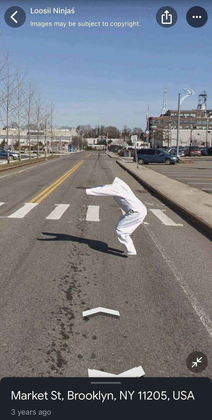 I was exploring the Brooklyn Navy Shipyard and decided to do a little drive around, and all of a sudden this guy shows up. At first I thought Google removed the face but when I zoomed in and tried to figure out what it is, the “person” started jumping around like shown in the pics. Also, when you try to drive past him, maps gives me a “server error” message. Got me spooked ngl.