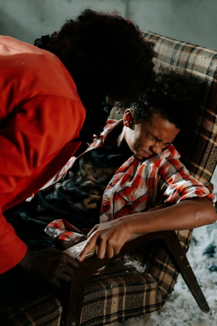 So he went upstairs to check on us, thinking we had broke something. And when he opened the door to the room he saw me lying on the ground and the kid, choking me by pressing his foot against my windpipe while smiling.
