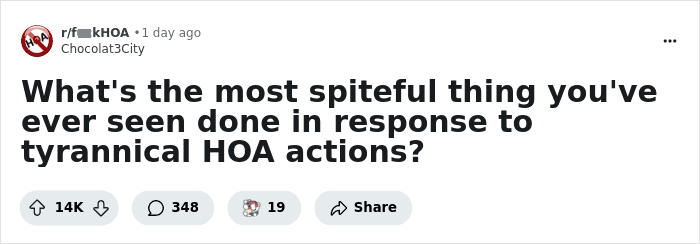 I read of a fam who was mad the HOA would not approve their preferred color of house paint. Apparently there were 5 or 6 approved colors. Period. So they painted the house striped in all the approved colors.