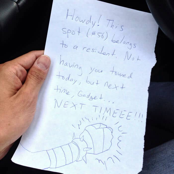 #21 Go Go Gadget Passive Aggressive Note. Left This Note On A Car. Don’t Park In My Spot