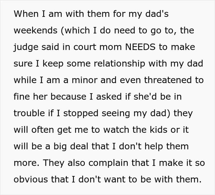 One teen, who’d much rather hang out with his mom, is forced by legal stuff to do time with his distant dad, stepmom, and three stepsiblings. Not exactly winning the family lottery, right? When his dad demanded he start babysitting the kids permanently (because nothing says “quality time” like involuntary childcare), he straight-up refused, and that’s when things got ugly.