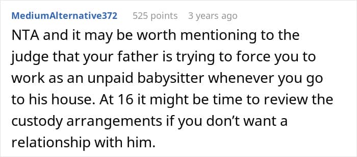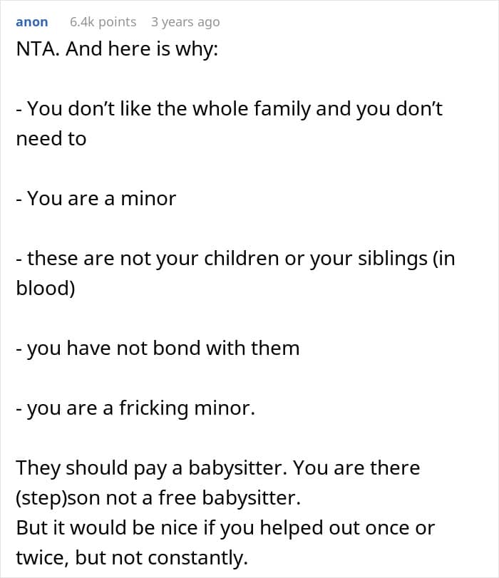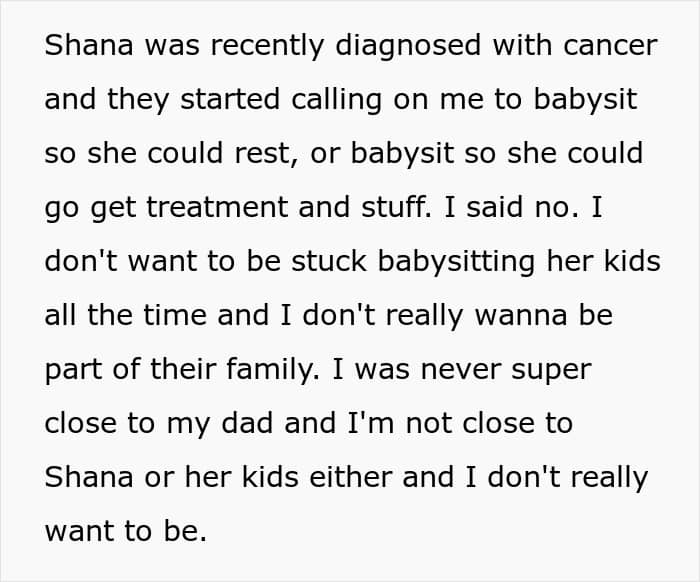 The 16-year-old original poster (OP) shared that he mostly lives with his mom, only seeing his dad every other weekend. His dad is married to Shana, who has three kids, all under 8. The arrangement was working out fine until life threw everyone a curveball: Shana got a cancer diagnosis, and his dad pushed him to start babysitting so she could rest up and get treatment. Plot twist: he’s not interested.