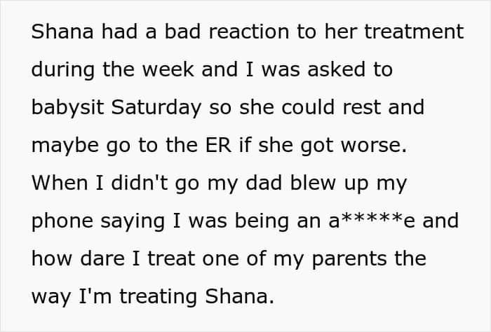 When Shana had a nasty reaction to treatment, his dad demanded he drop everything and babysit on the double so she could rest and possibly head to the ER. When he said no again, his dad unleashed a phone-bombing campaign, throwing around words like “cruel” and “ungrateful.”