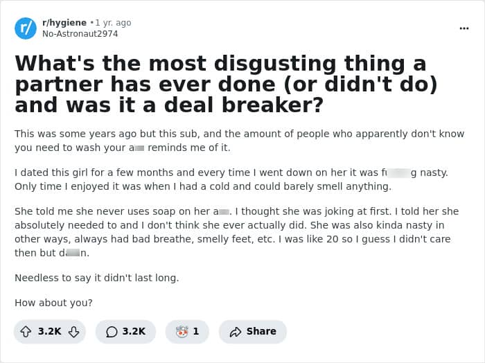 “Getting the ick” is a modern way of describing those little (or not so little) things one’s partner may do that are just major turn-offs. Often it’s associated with petty, personal preferences, but there are folks out there who’s behavior is so gross that it’s a wonder anyone dated them. Someone asked “What’s the most disgusting thing a partner has ever done (or didn’t do) and was it a deal breaker?” and people detailed their worst stories.