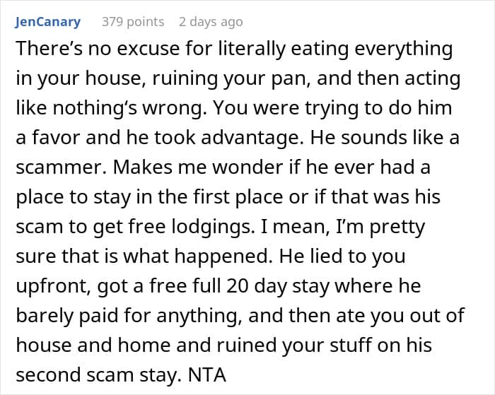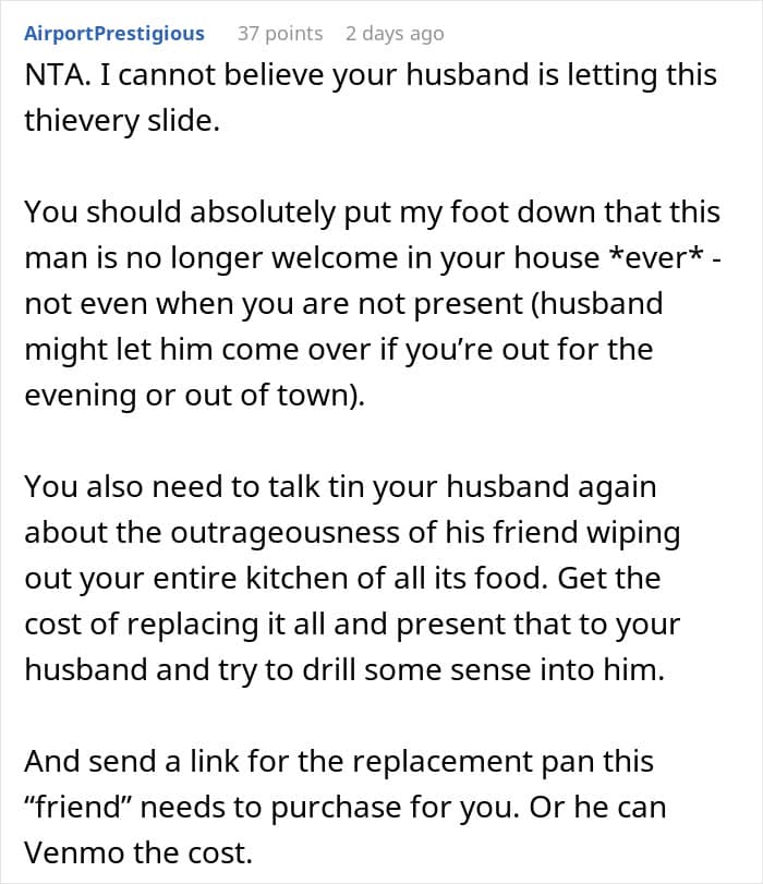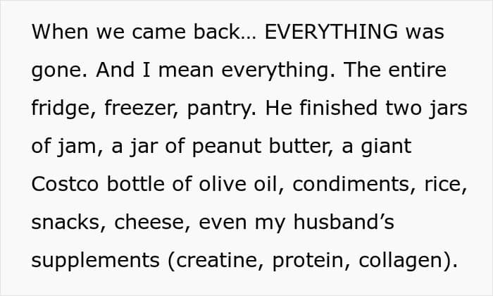 Some people behave so shamelessly that it’s frustrating to read. Internet user u/Capable_Candy6712 opened up to the AITA community about how her and her husband’s pal stayed at their place when he had nowhere else to crash. But instead of being grateful for the help, the man ate “literally everything” in their home. And that’s not an exaggeration, by the way. Scroll down to see how bizarre things got.