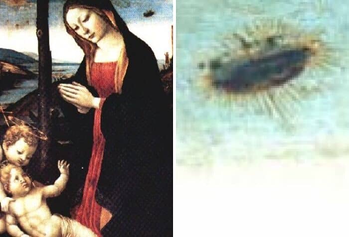 Painted in the 15th century, “The Madonna with Saint Giovannino” appears at first to be a typical Renaissance religious scene, but a strange detail in the sky has fascinated UFO enthusiasts for decades. Hovering in the background above Mary’s left shoulder is a small, dark, disc-shaped object that appears to be radiating golden rays. Below it, a man and his dog can be seen on a cliff, shielding their eyes as they stare up at the mysterious object, an inclusion that suggests the artist intentionally depicted an anomalous aerial phenomenon.