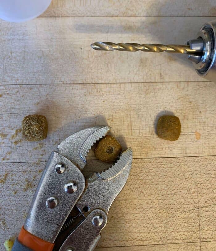 This is his dog’s food. Cat is obsessed with it because it’s not hers, and that’s why my dad tried it. It should work exactly once before she figures it out, and he moves on to the next super fun idea.