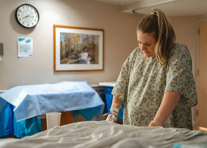 I was in the ER late at night having a what I thought was a heart attack, but turned out to be a gallbladder attack. After being led to a room and put into a bed, I told my wife I was going to be sick. She rolled a trashcan over to me and went to get a nurse.