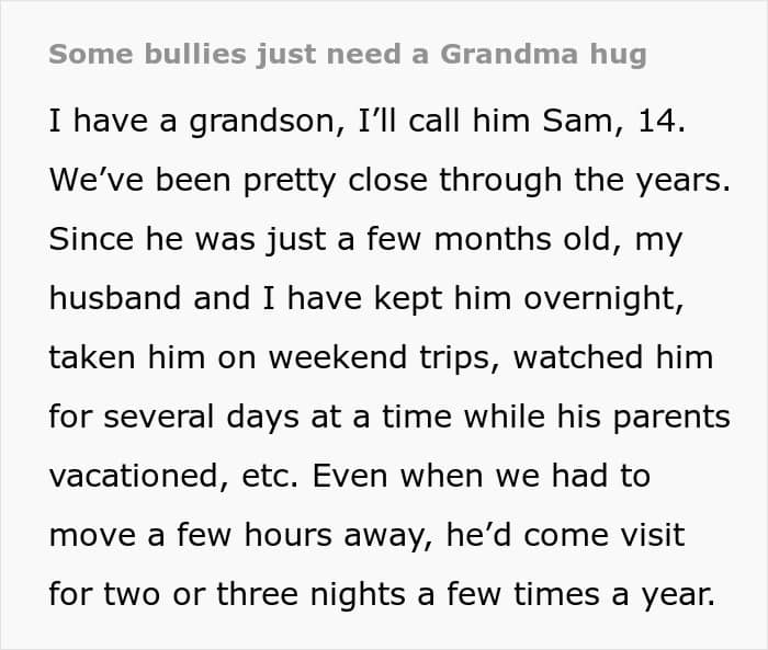 In a delightful post on r/pettyrevenge, a lady who goes by RumBunBun online shared how she used her wit to protect the special bond she has created with her grandson and to teach his peers a lesson in kindness.