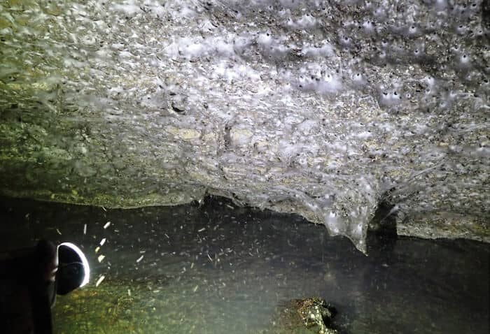 These midges feed on microbial slime produced by sulfur-eating bacteria, forming the base of this strange and unique underground food chain.