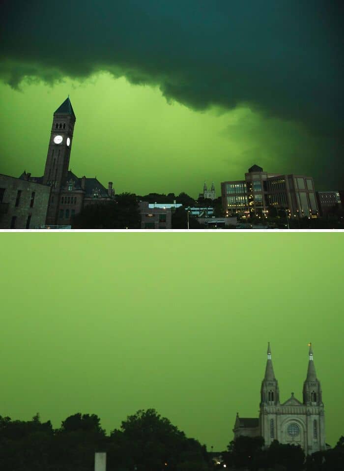 These yellow and green skies are formed by a combination of blue light (from rain, hail, and suspended water) and yellow light (from the sun low in the sky). This storm is particularly dramatic because it’s forming on the inside of a shelf cloud, which are the leading edges of thunderstorms.
