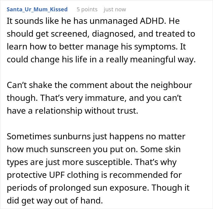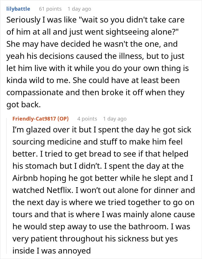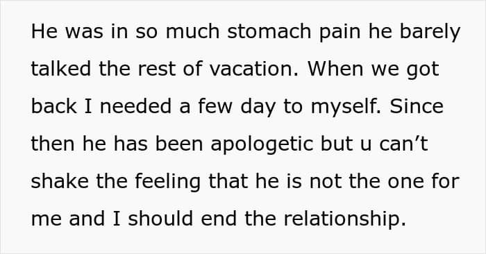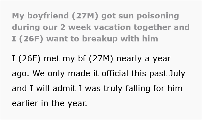 For one woman, her first vacation with her new boyfriend fell firmly into the second category. He failed to take care of himself, ended up with severe sun poisoning that made the trip miserable, and revealed other red flags that left her questioning whether he’s truly the right partner for her.