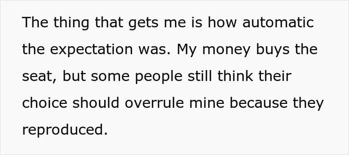 What do you think? Should OP have given up her seat, or was her reality check exactly what the family needed? Share your thoughts in the comments!