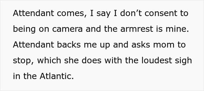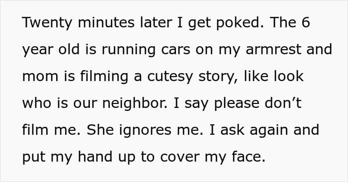 Twenty minutes later, one of the couple’s kids was using her armrest like a racing track for his toy car, with his mom filming everything, including the non-consenting woman