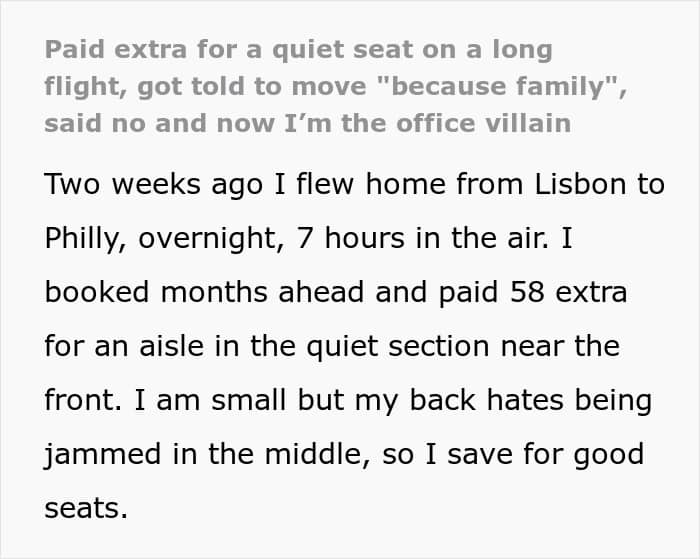 After surviving the journey, OP faced round two: office gossip. A coworker from the same flight told others she’d refused to help a family, earning her the nickname “the ice queen of accounting.” But OP stood firm; she paid for that seat, needed rest, and wasn’t about to sacrifice her comfort because someone else hadn’t planned ahead. Annoyed, she turned to netizens to find out what they thought of the whole seat-swapping mess.