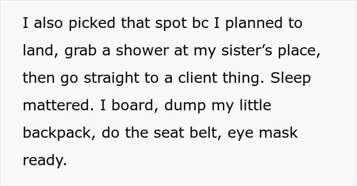 The father wanted OP to switch her premium seat for a middle spot near the bathrooms. When she politely declined, explaining she’d paid for comfort and sleep before a work event, the family acted as if she’d personally ruined their vacation. The flight attendant backed her up, but the drama was only starting.