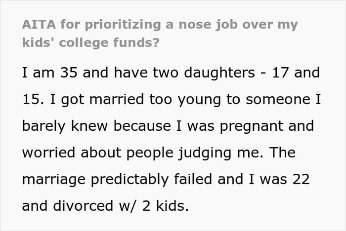 One mom got a lot of flak online after revealing that she decided that she wants an expensive nose job, instead of using the money to set up her daughters’ college funds. This started a whirlwind of drama in her family. Scroll down for the full story and the internet’s emotional reactions to the sensitive topic.