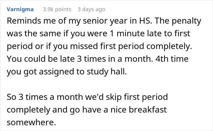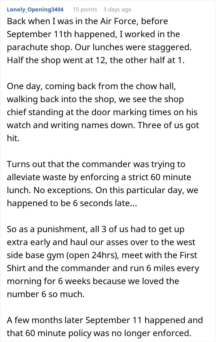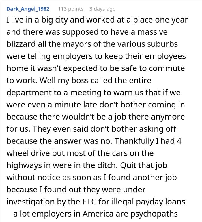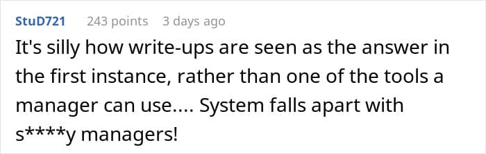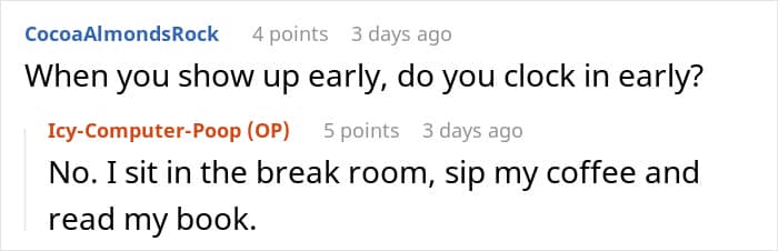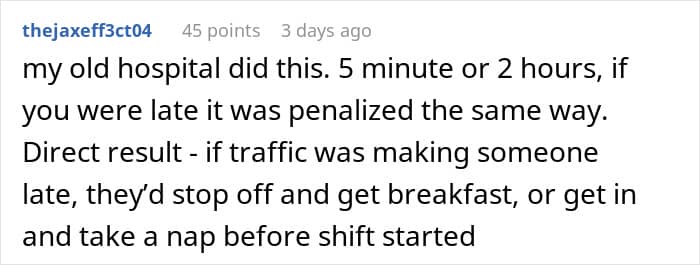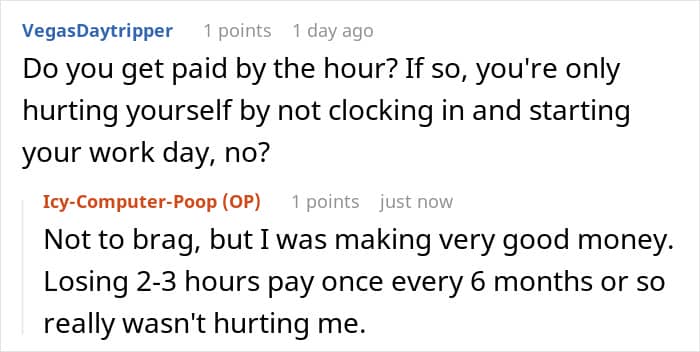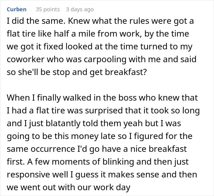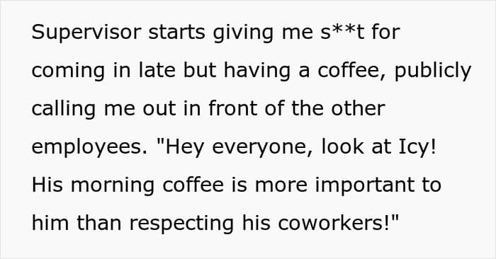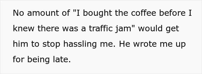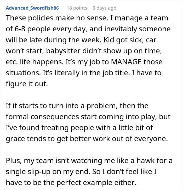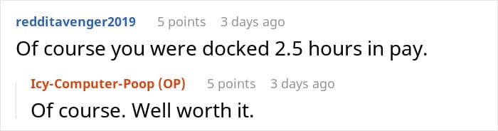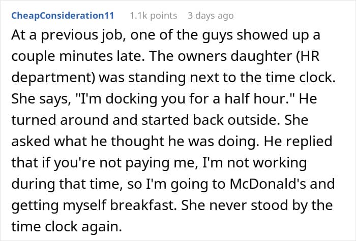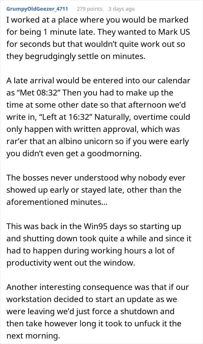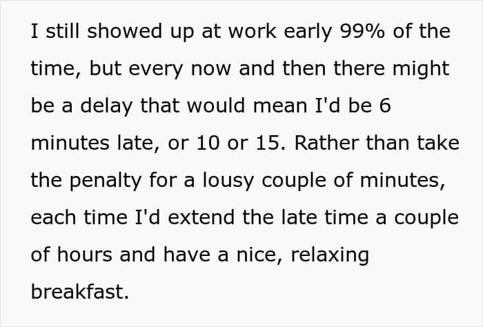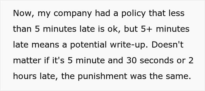 However, not all bosses are like this. For example, this employee’s supervisor wrote him up for being 6 minutes late for something that was entirely out of the worker’s control. Granted, he was following the company’s policy, but the employee decided to start mischievously complying every time he saw he was going to be late.