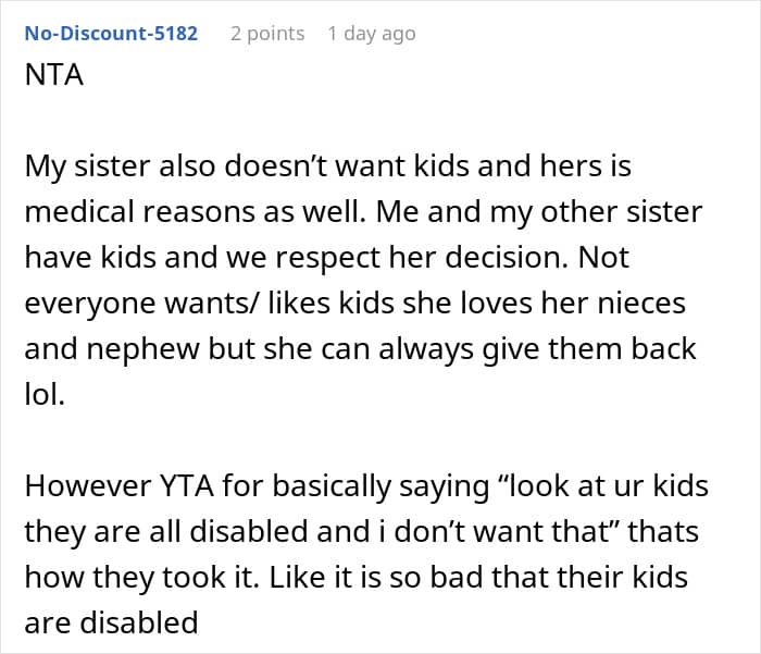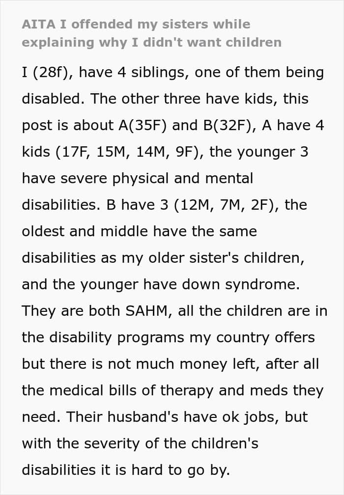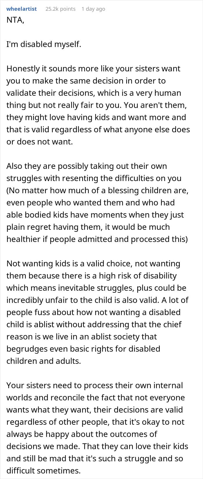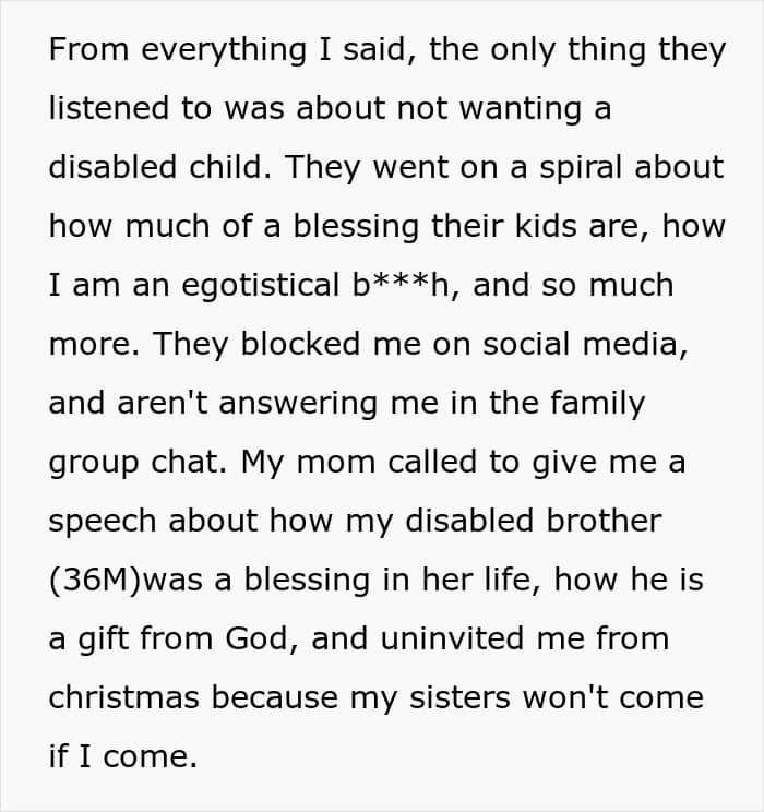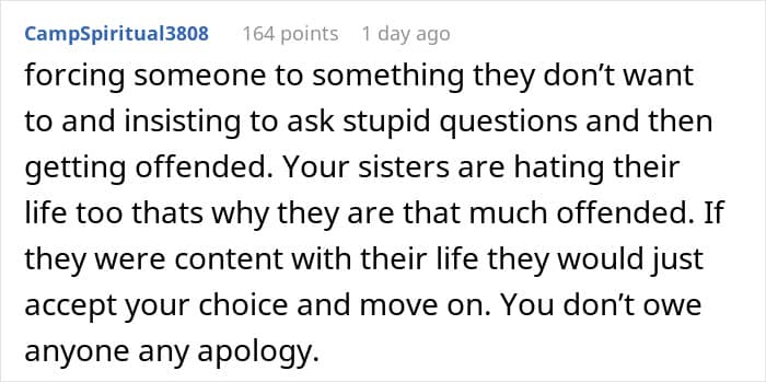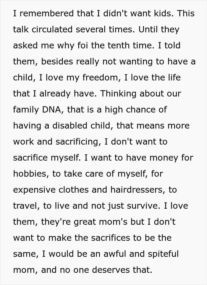 That’s something one Redditor experienced with her own family. After informing her sisters—all of whom are mothers—that she doesn’t plan to have kids, they immediately took it personally. So much so, that they uninvited her from Christmas and blocked her on social media, leaving her unsure of what to do next. Below, you’ll find all of the details, as well as some of the replies readers shared.