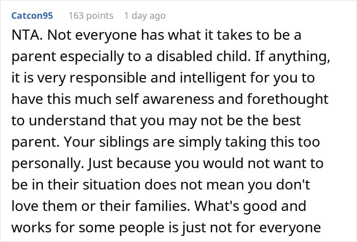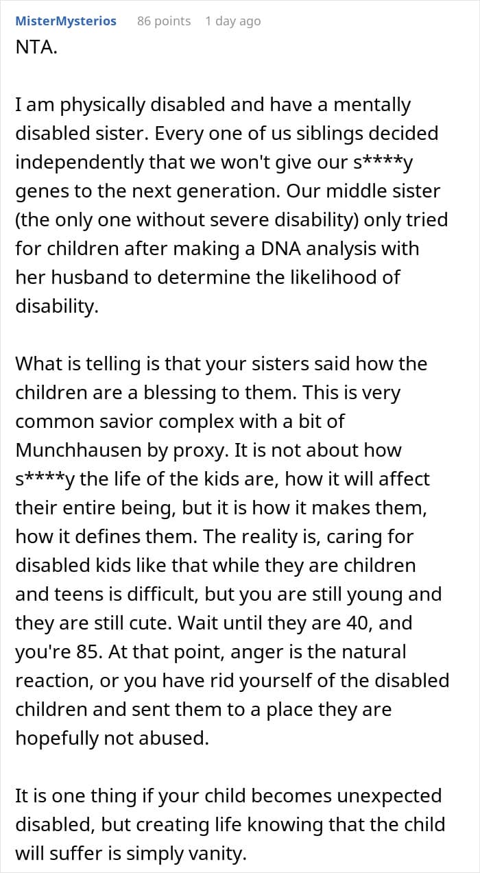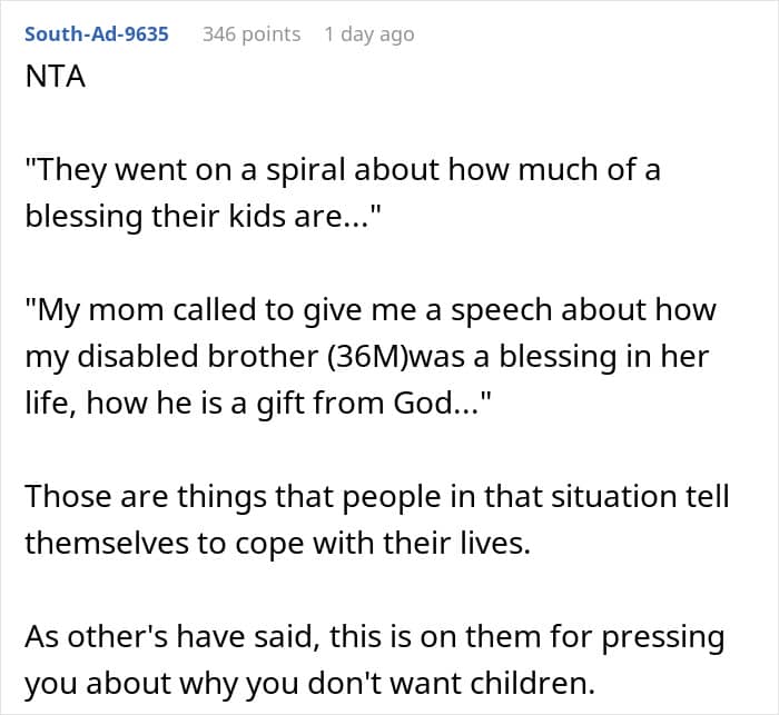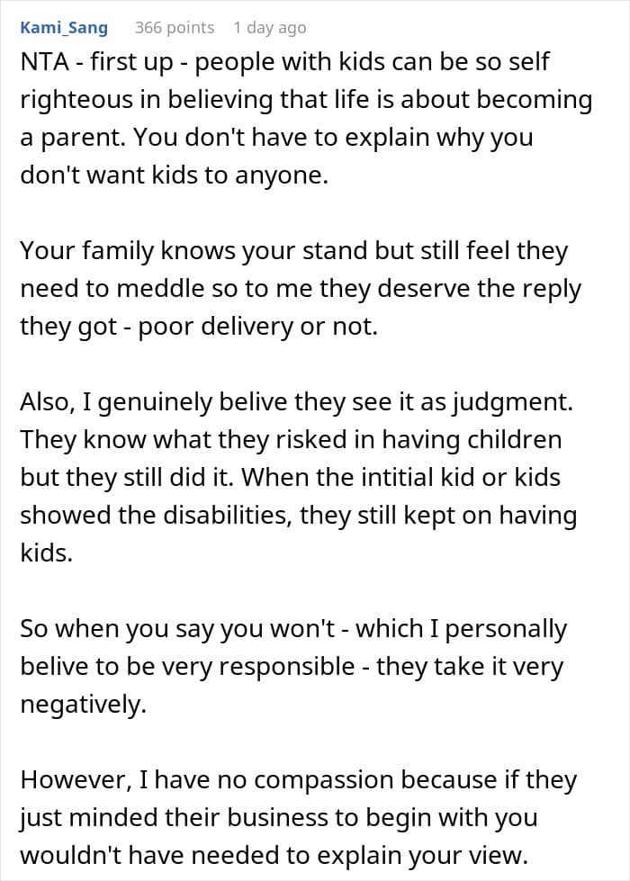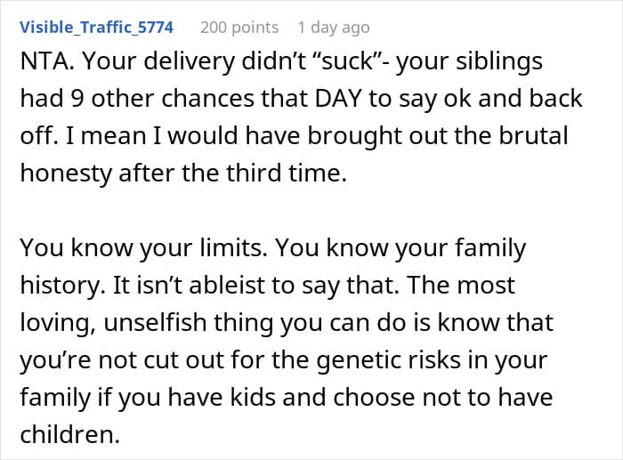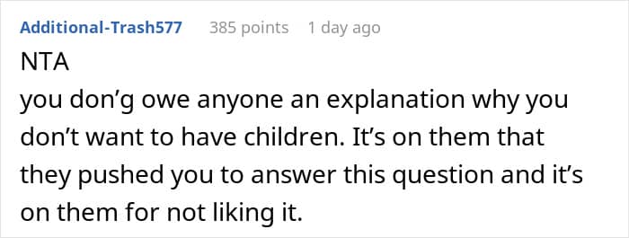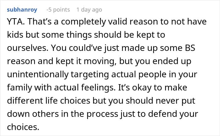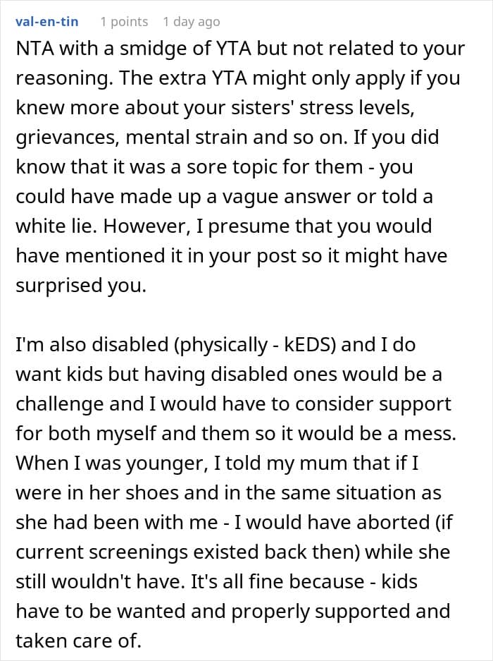 That’s something one Redditor experienced with her own family. After informing her sisters—all of whom are mothers—that she doesn’t plan to have kids, they immediately took it personally. So much so, that they uninvited her from Christmas and blocked her on social media, leaving her unsure of what to do next. Below, you’ll find all of the details, as well as some of the replies readers shared.