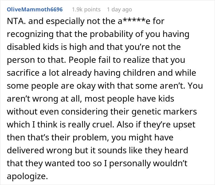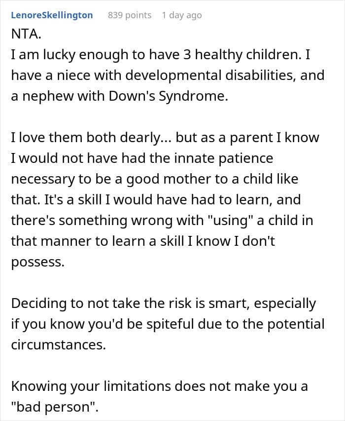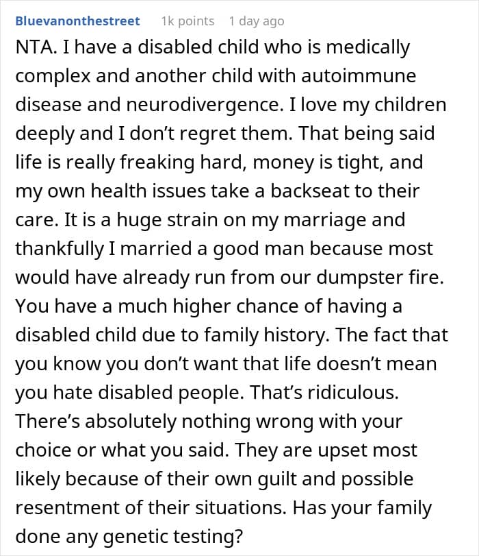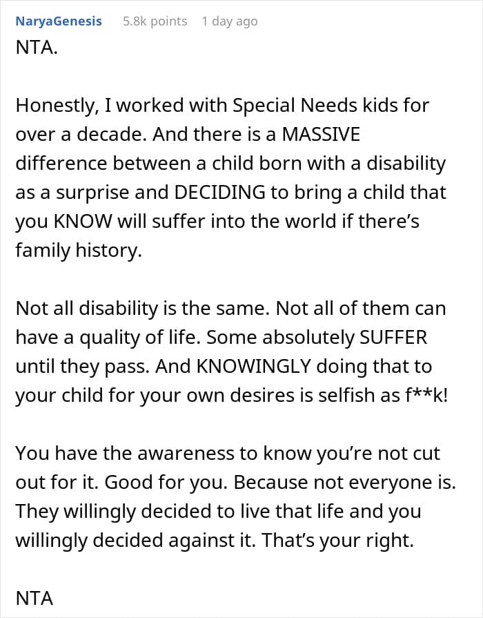 RELATED:The woman chose not to have kids, partly because of her family’s history of disabilities