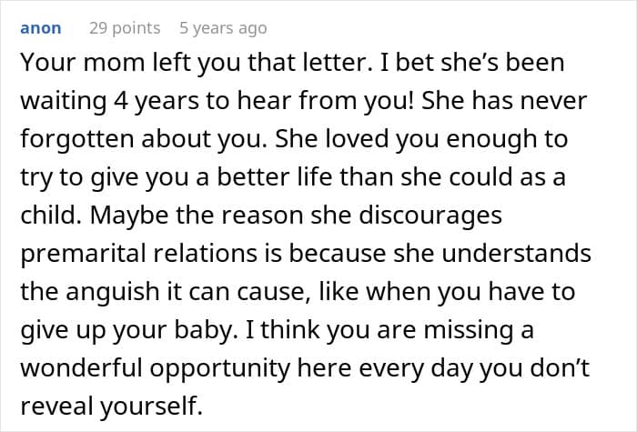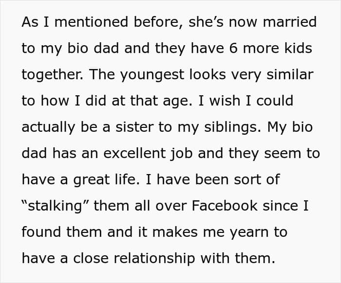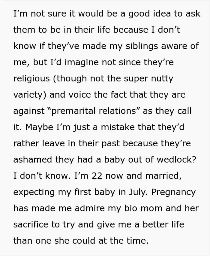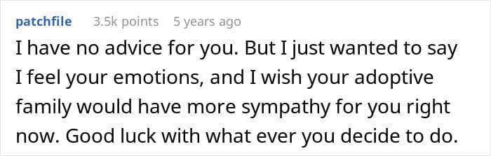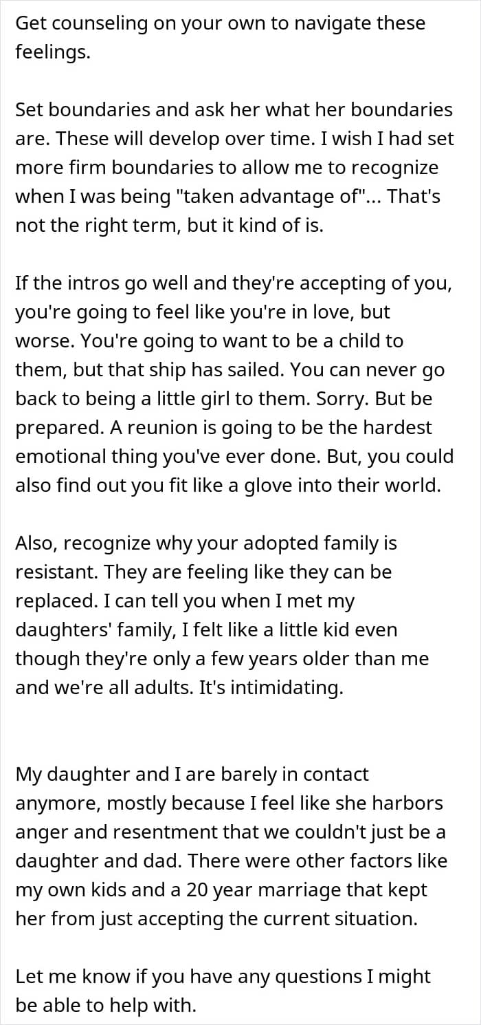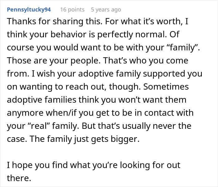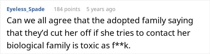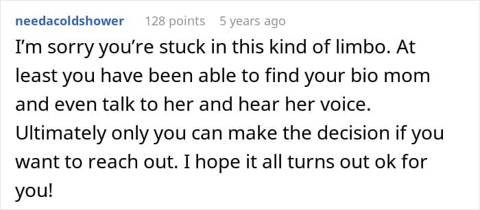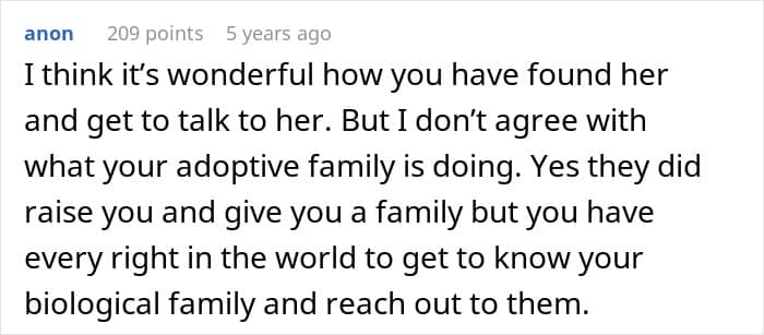 That said, it is understandable for someone to seize such an opportunity immediately. This was the case for a woman who found her biological mother after doing some digging. However, her adoptive family immediately blocked her intentions of fully reconnecting and even threatened to cut her off emotionally.