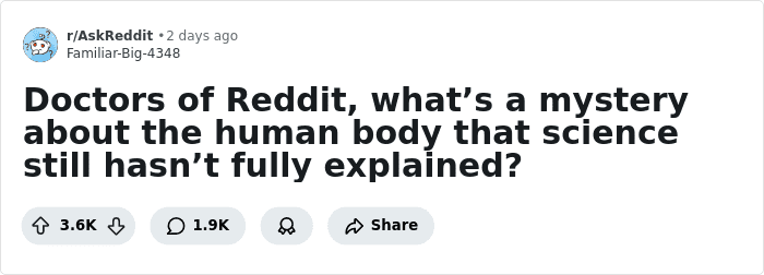 Someone recently asked doctors, “What’s a mystery about the human body that science still hasn’t fully explained?” and the answers came pouring in faster than you can say, “I really don’t know.” It wasn’t only medical experts giving their two cents, but also ordinary people who’ve been met with blank stares after asking a doctor about something seemingly simple.