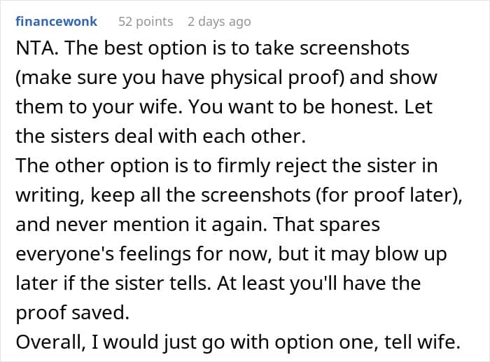 Secondly, if it comes to a confrontation, the sister could perhaps lie to protect her own relationship. Not telling the wife and then only revealing the text messages later would look suspect. If the SIL is willing to be a homewrecker to her own sister, there is no telling what else she is willing to do. After all, she is risking being ostracized both from her “crush” and perhaps her entire immediate family.