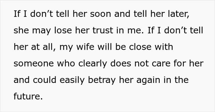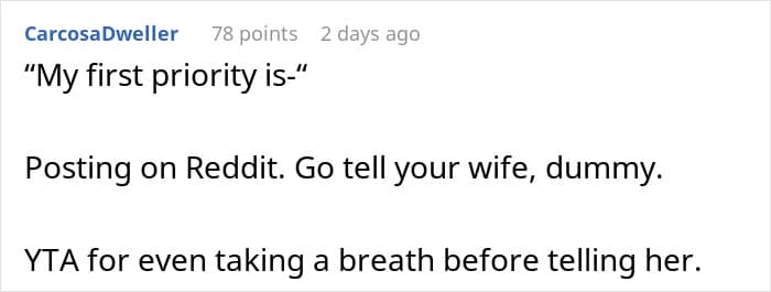 While it’s pretty common to post various stories and queries to the “am I the [jerk]” online group, this was one of those rare ones where most readers thought it wasn’t necessary. After all, the husband hadn’t done anything and was only guilty of perhaps not telling his wife immediately. Indeed, the fact that he had to think about it might actually come back to haunt him.