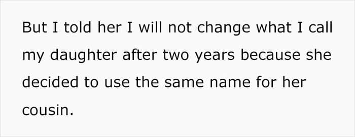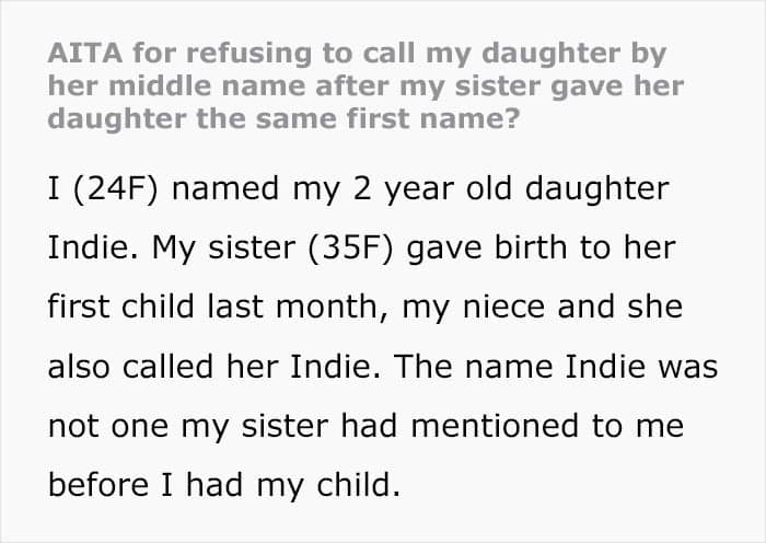A woman asked the internet for advice when her sister chose the same name for her daughter and started asking her to call her own child something else. This was two full years after the birth of OP’s daughter. We reached out to OP via Reddit and will update the article when she gets back to us.