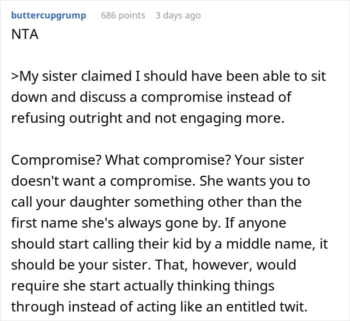 The sister’s suggestion to use the middle name is strange from two perspectives. Firstly, she is in no position to be making these sorts of demands. OP has had a kid for two whole years already, and the sister at no point tried to make any sort of claims, so why she thinks she can pull this sort of stunt now is anyone’s guess. Normally, naming drama happens before the child is even born, but in this case, all the issues could have been avoided if the sister simply made better decisions.