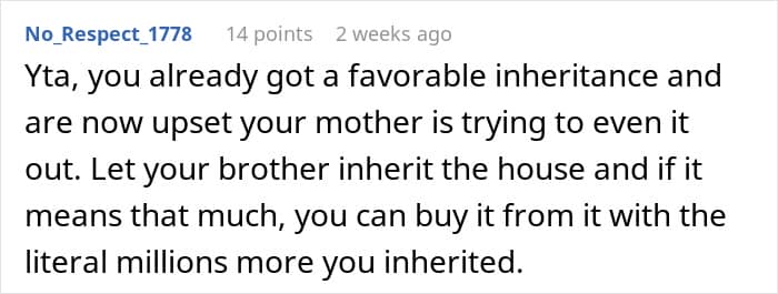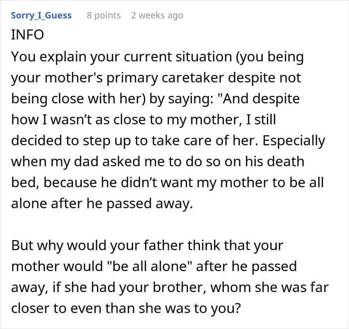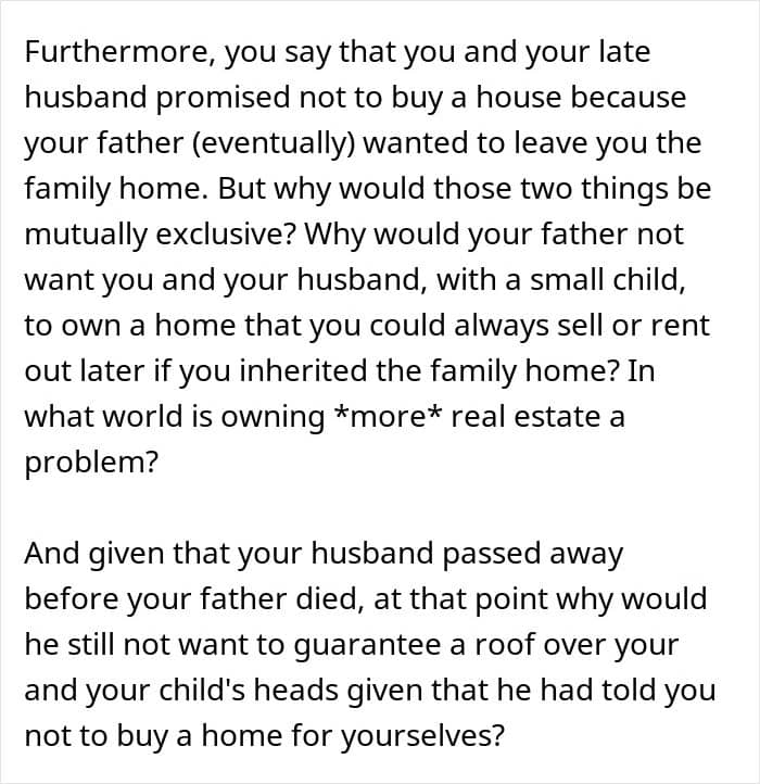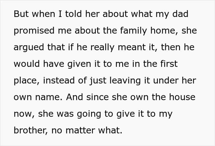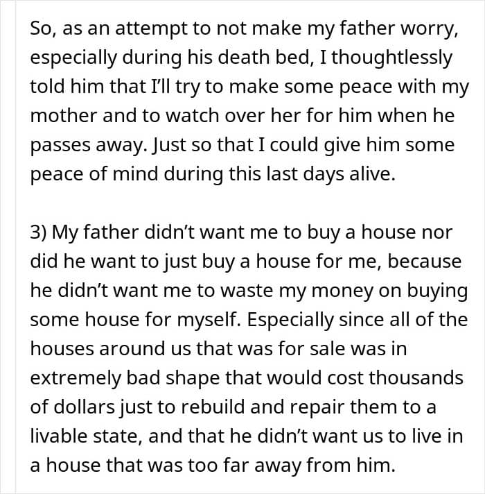 More importantly, it was a lot more than what the mother had to leave behind. It seems like the woman wants the house and the money because of an oral agreement she had with her father. The fact that neither parents actually sat down to figure out a joint plan is just selfish. Without “protagonist bias” the woman’s question seems a lot more bleak, she is asking if she should no longer take care of an elderly woman, after inheriting the majority of her money, because she also has the house she wants.
