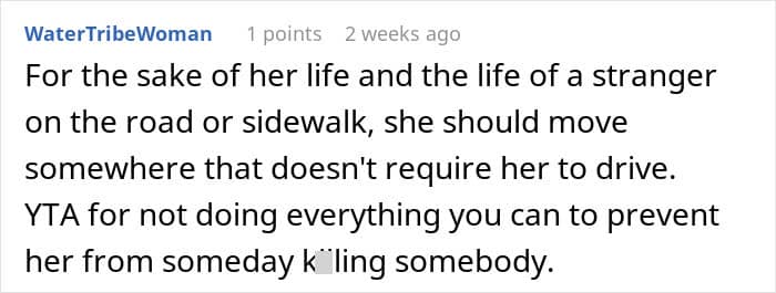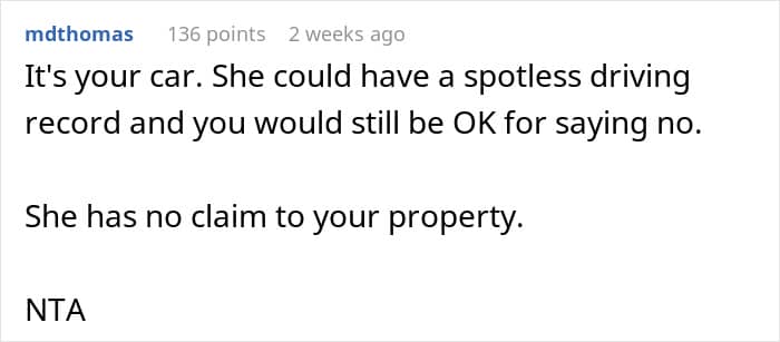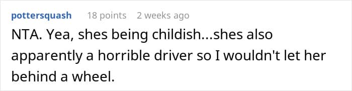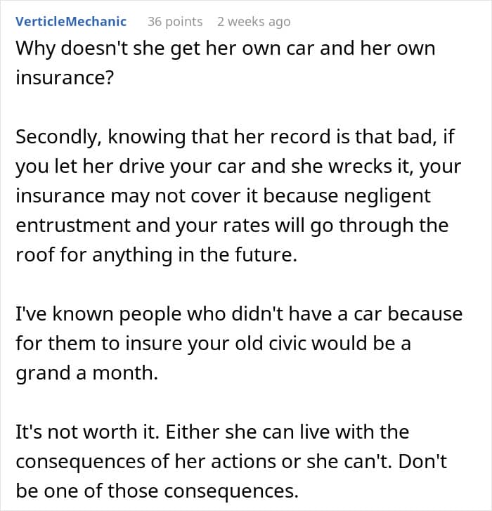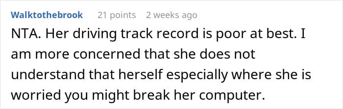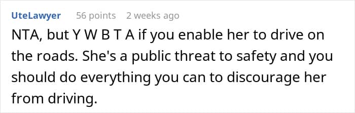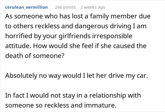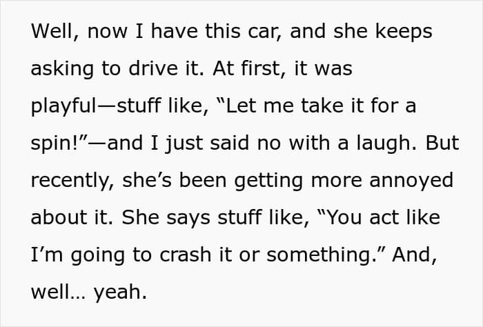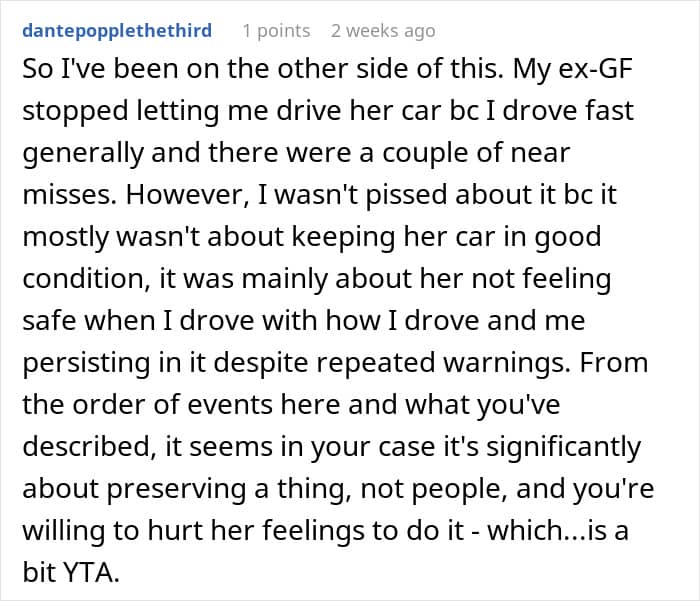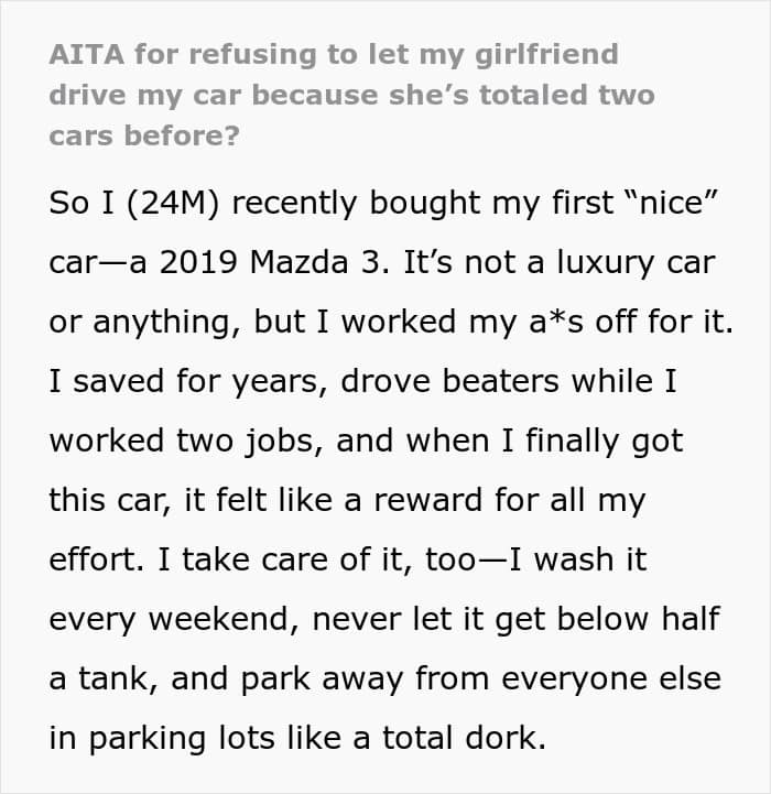 A man refused to let his girlfriend drive his new car because of her history of multiple accidents. This caused the woman to feel a lack of trust from her partner, causing a rift between them.