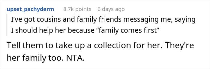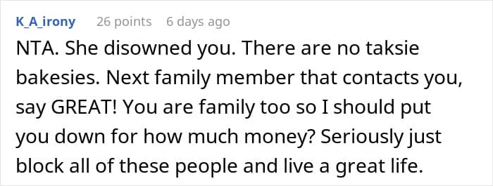 You can be charitable. You can be empathetic. What you do with your money is your choice. However, it’s not your duty to suddenly use up all of your resources to solve everyone else’s problems, both large and small. They’re grown-ups, too, who have to take care of their own finances. Moreover, they have to take responsibility for their actions. Disowning someone does not entitle you to their inheritance. Judging someone for who they are does not mean that you get rewarded.
