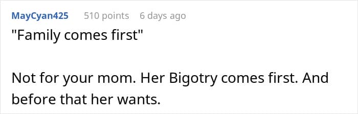 Family comes first, sure, but this doesn’t mean that you can suddenly throw all the relevant context out the window after you’ve been rejected time and time again.