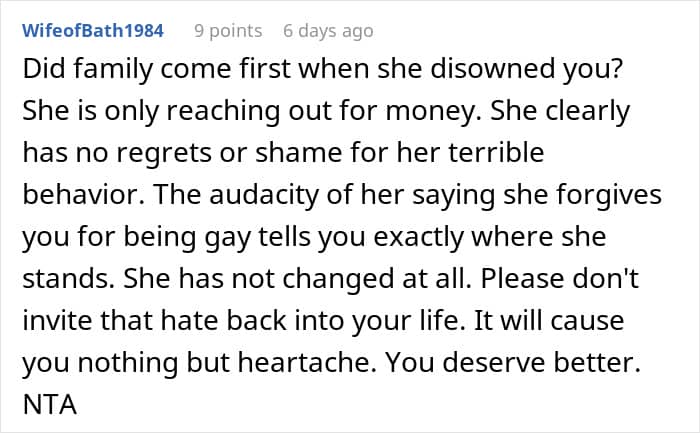 Redditor u/Mindless_School2475 opened up to the AITAH online community about a very sensitive situation in his family. He shared that his mother, who had cut him out of her life when he came out as gay, suddenly showed up in his life again, asking for part of the inheritance he’d received.
