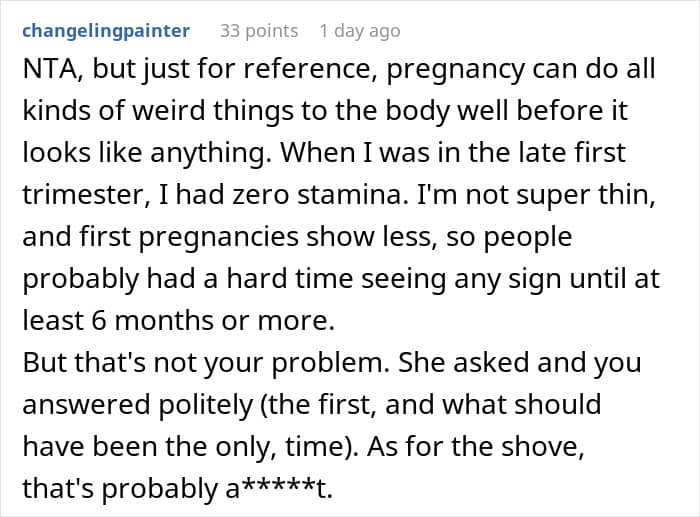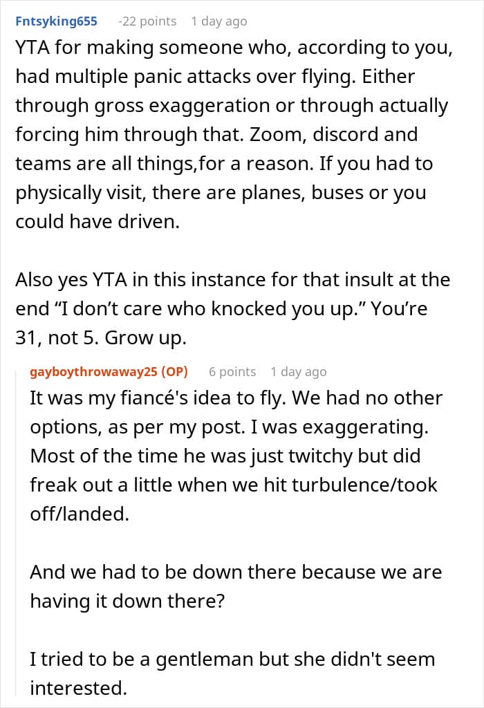u/gayboythrowaway25 agrees with other Redditors that his last comment to the pregnant lady wasn’t that nice. “I don’t regret keeping my seat,” he reiterates nonetheless. “It was an early flight and I didn’t sleep too well so I was a little irritable. I recognize that the ‘knocking up’ comment was kinda coarse and I should have been a bit more eloquent, I think.”