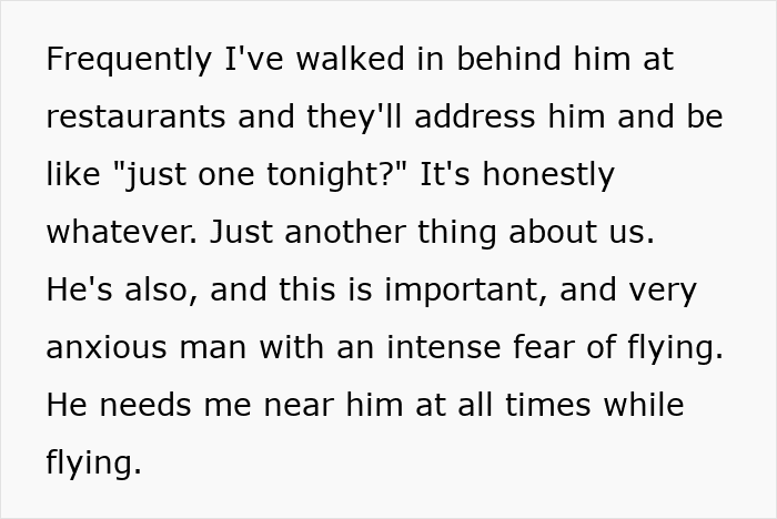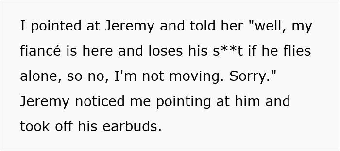 “We started taxiing not too long after she sat down, but before that, [the energy in that row] was pretty varied,” the Redditor recalls. “I was miffed but busy making sure Jeremy had everything he needed. Jeremy was a bit on edge, I think, but it’s hard to tell if that was because of the whole plane about to take off thing or the interaction.”