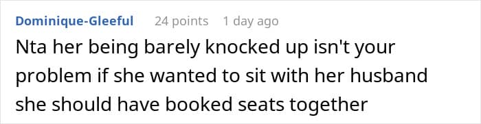 Still, this pregnant lady expected a passenger to give up their seat so she could sit beside her husband. However, the man refused, since his partner needed company next to him. And, because she was barely even showing and her husband wasn’t really protesting, the man questioned whether she really needed the seat.