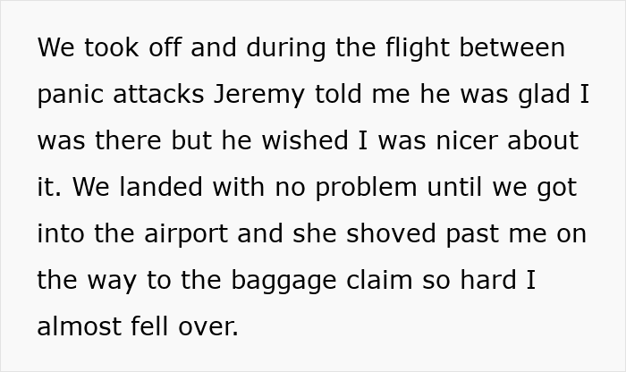 He also clarifies that the shove the woman gave him after the flight wasn’t as aggressive as some commenters made it out to be. “I said ‘shoved’ but it wasn’t an open palmed two-handed shove or anything. It was more of an extra rough shoulder check that caught me off balance and my fiancé stopped me from falling. He yelled after her but she didn’t respond,” the Redditor recalls.