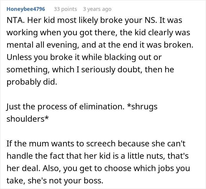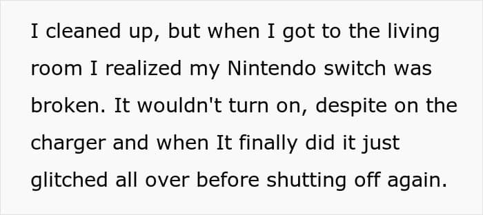 He explained that he already had another babysitting gig and that he wouldn’t babysit for her again until he could fix his Nintendo switch, leaving her furious
