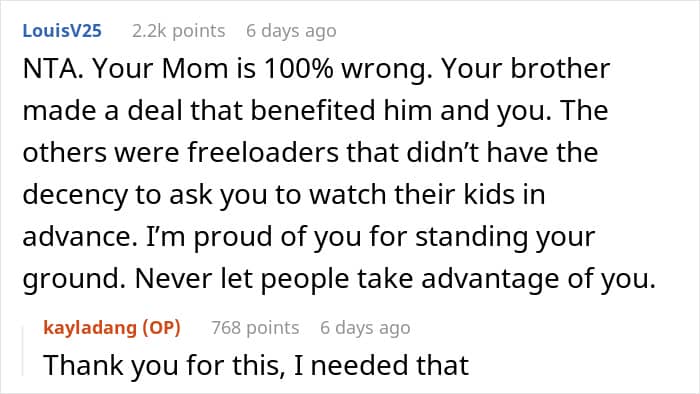 However, she tells us that the relationship with some of the parents changed after she refused to be their free babysitter. “The newer people were the ones I really had trouble with. I no longer offer and refuse to watch their kids in group settings. My brother and the others agree and back me up if problems arise from this decision.”