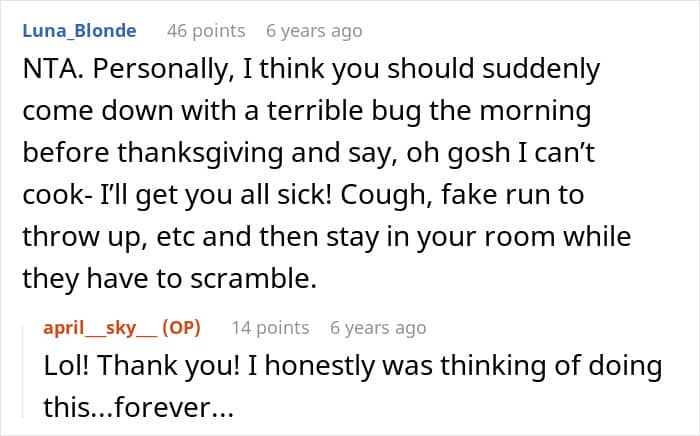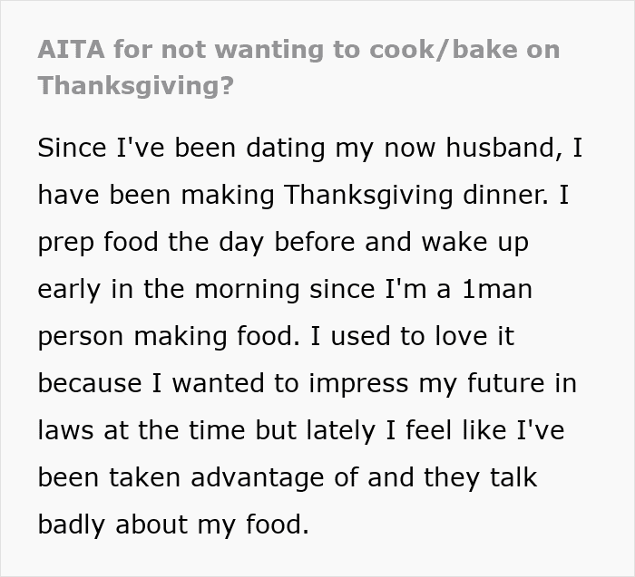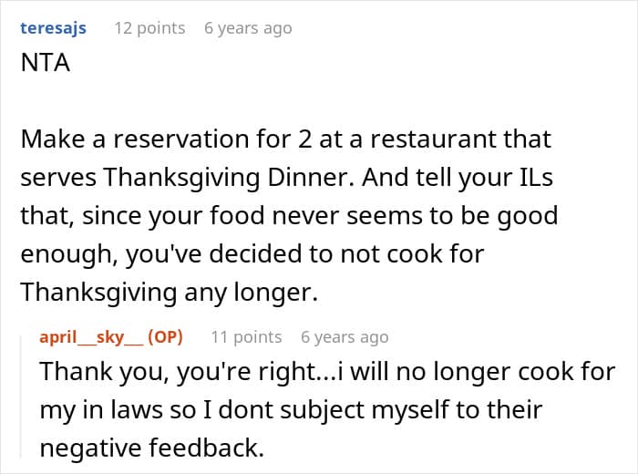 And now the original poster has decided to take the issue head-on. First, she declared that she no longer plans to cook for Christmas or Thanksgiving for the in-laws, who don’t appreciate her. Secondly, the woman decided to spend the holidays with her relatives to “recharge her batteries” and reflect on her life as a whole, including her future plans.