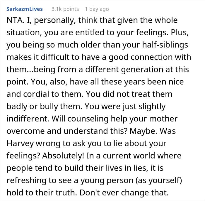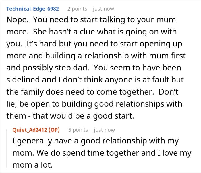 The mom got upset when she learned about it, while the stepdad called the teen selfish for not lying to her mom about her feelings, but people online reassured her that she wasn’t selfish
