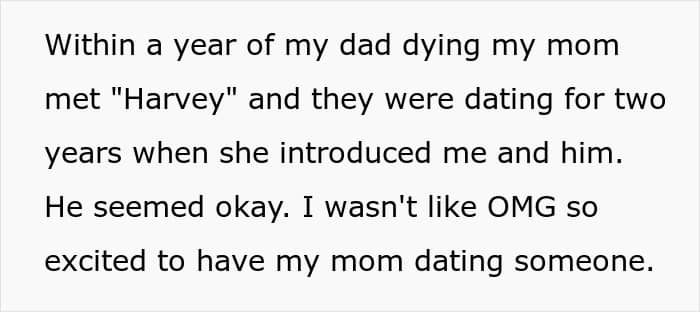 When the OP was 10, she lost her dad. Now that she’s 16, her mom is married to a guy whom she met within a year of her ex-husband’s death. Let’s just say that the OP feels quite indifferent to her stepdad – she isn’t too excited about him but has no feelings of hate, either. He’s just okay, but more importantly, he makes her mom happy, even though the author will never think of him as her second dad.