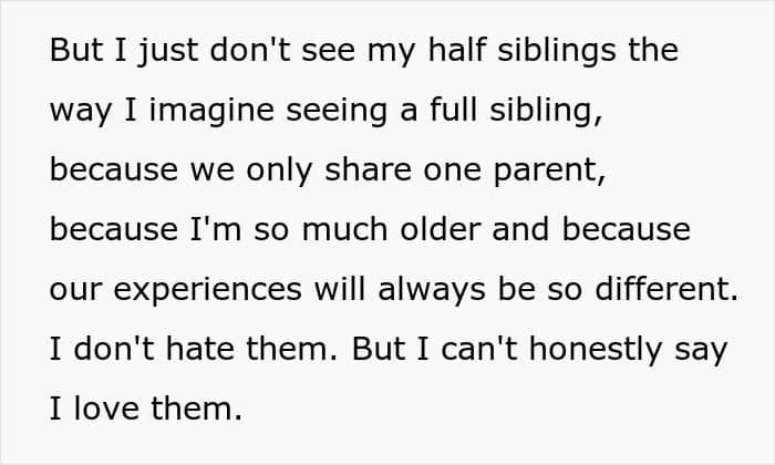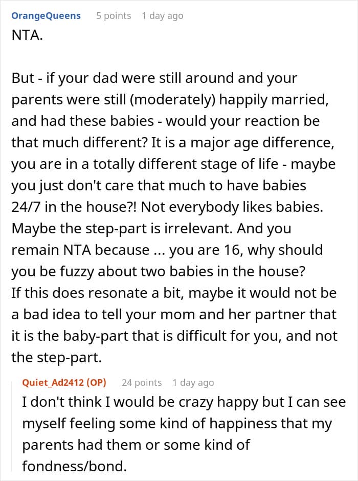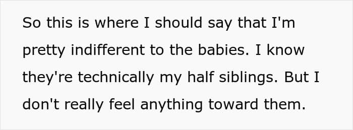 The OP’s mom and her husband now have two new kids – 17 months old and 3 months old. The thing is that the original poster feels quite indifferent to the babies, just as she does with her stepfather. She sees these babies as not full but rather half-siblings because they are actually her half-siblings. Additionally, the age gap between them is so big that she doubts they will ever have relatable experiences.