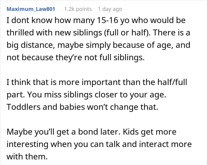 Typically, a baby born into a family is a joyous occasion. It’s a new life, a new addition to your family! Yet, sometimes, not everyone feels this way. Like in today’s story, where a teen’s mom had children with her new husband, but the teen felt pretty indifferent to her new siblings, or better said, half-siblings. And, well, that caused quite a commotion in their family when the mom learned about it.