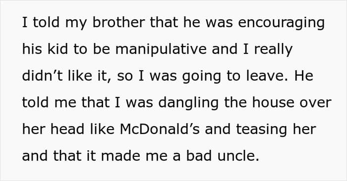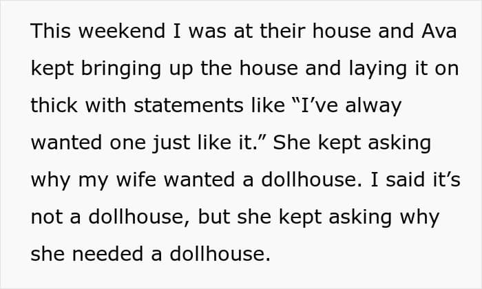 When the poster went to their house over the weekend, even Ava broached the subject, asking why his wife needed a dollhouse and saying that she wanted it. Probably frustrated by the pestering, OP told his brother that he was encouraging Ava to be a manipulator, but he retaliated that the poster was being a bad uncle.