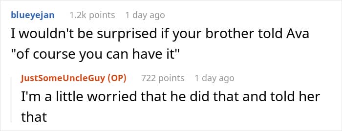 It’s no wonder that the niece also wanted it, but Redditors said that the way she was demanding it was wrong. They claimed that it must have been her father who said that she could have it and that’s why she was so adamant about it, and even the poster confirmed this in the comments.
