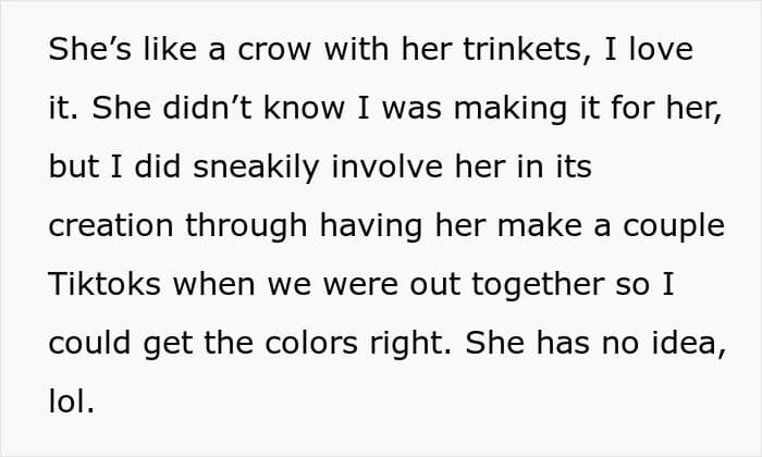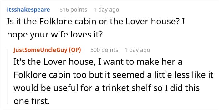 Many people appreciated that the poster was making so much effort for his wife and also standing up and explaining whenever someone called it a “dollhouse.” They also felt that it would be a weird gift for a niece, and even OP said that it would actually be weird to gift a “Lover” House to Ava.